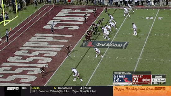 Moore’s touchdown capped off a wild 12-play, 82-yard drive that included a 57-yard completion from Matt Corral to Braylon Sanders on fourth-and-24 from the Ole Miss 14-yard line. In all, the drive included five penalties, including a Mississippi State offsides penalty that gave Ole Miss an automatic first down on a fourth-down play from inside the MSU 10.