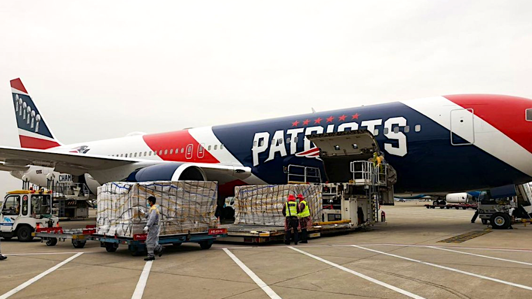 Gov. Charlie Baker tweeted a photo of the aircraft and wrote: “No days off. Thanks to some serious teamwork, Massachusetts is set to receive over 1 million N95 masks for our front-line workers. Huge thanks to the Krafts and several dedicated partners for making this happen.”